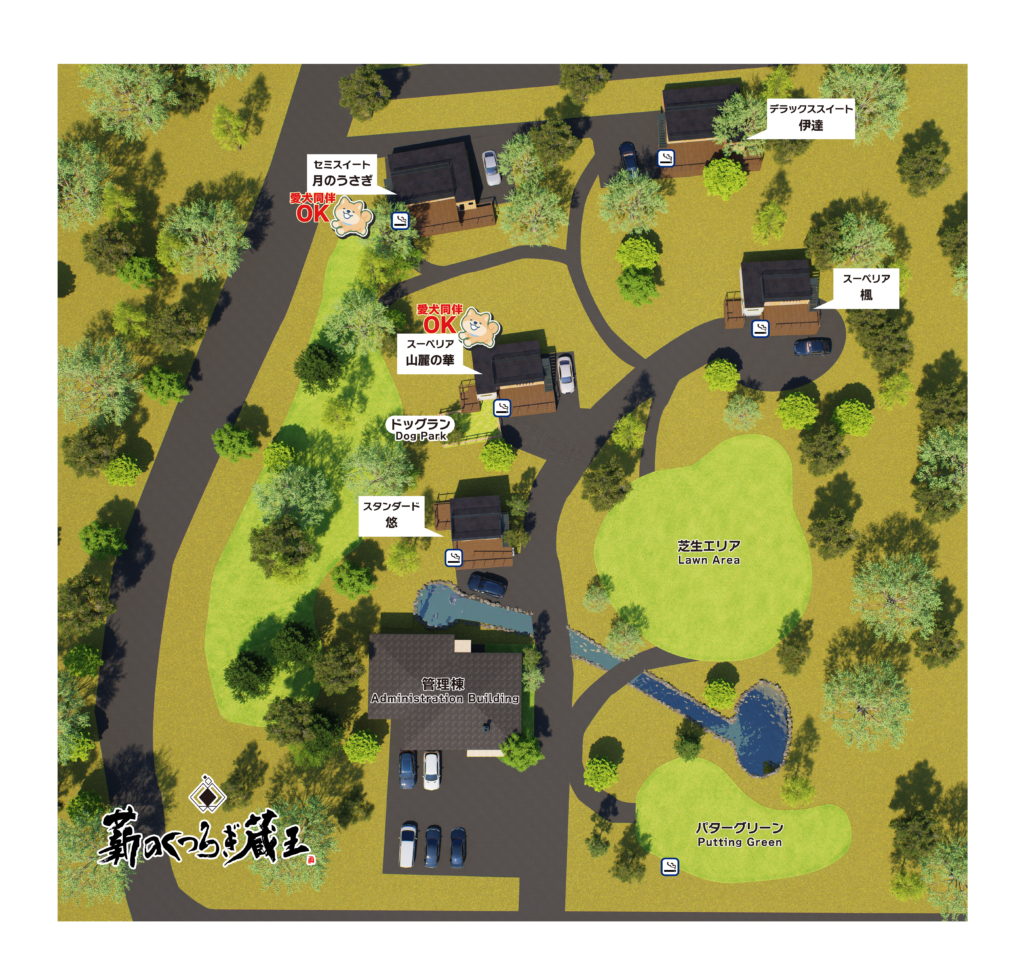 薪のくつろぎ 蔵王の魅力や、パターグリーンを始めとする当施設内でのアウトドア設備、ラウンジなどの共用サービスについてご紹介いたします。ワンちゃんとのご宿泊をご希望されるお客様向けのご案内もご覧いただけます。